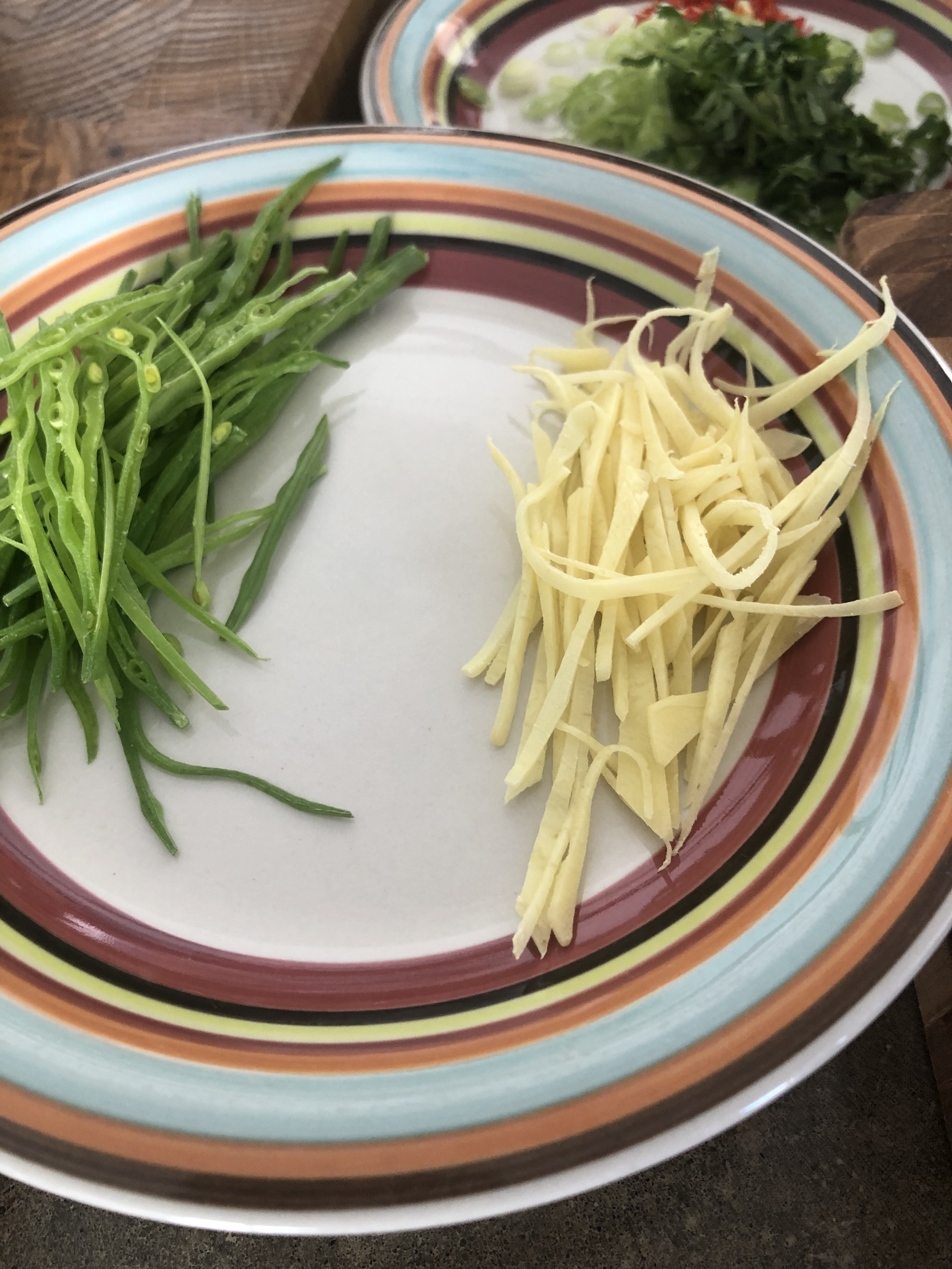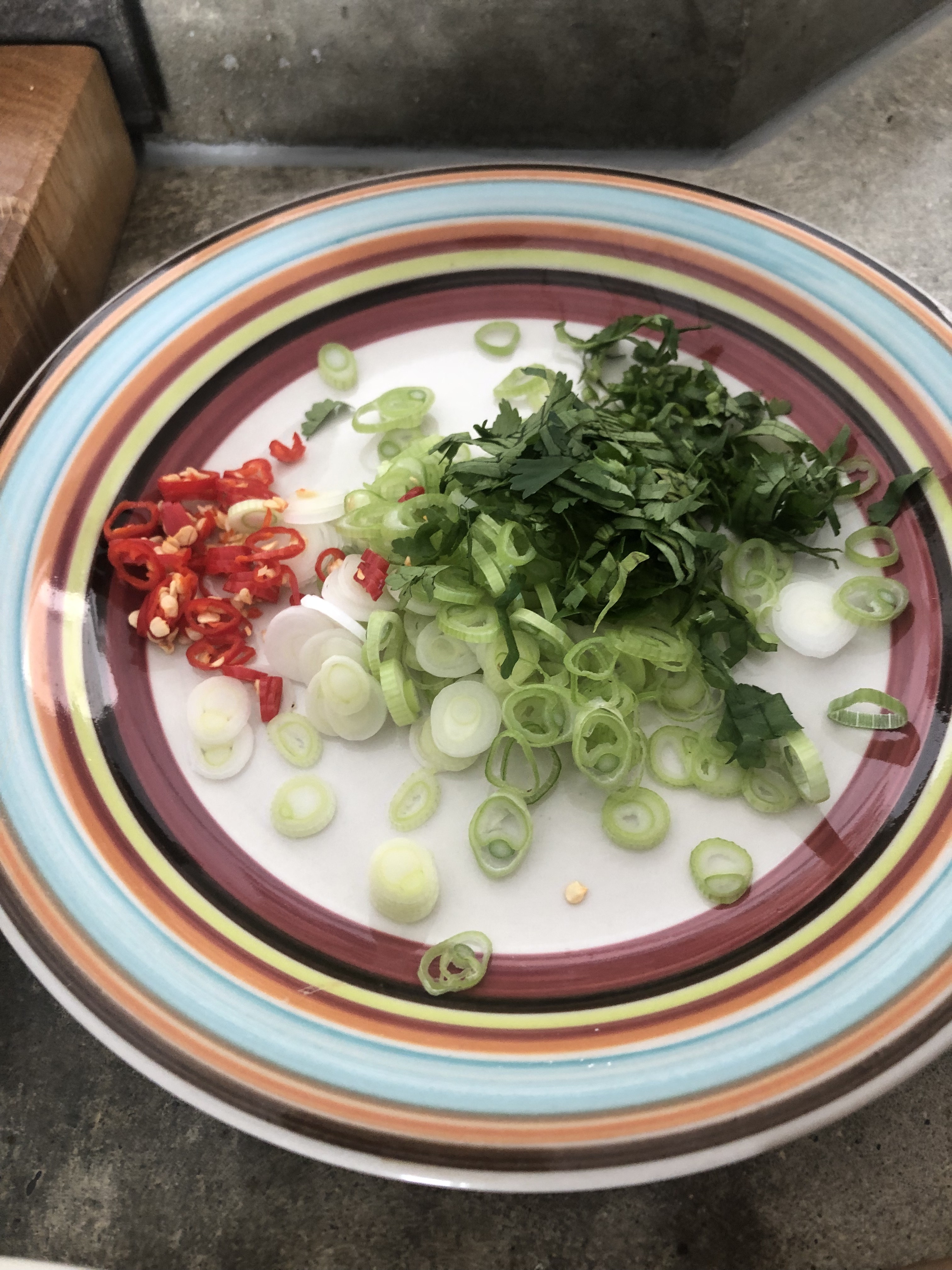 - Thinly slice onions, carrots, ginger, mange-tout, spring onions and chilli.