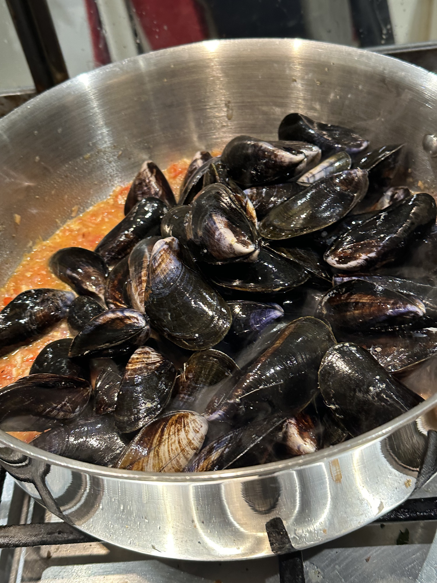 - Cook the Mussels: Add mussels to the pan, cover, and cook until they open (about 5 minutes). Discard any that don’t open.